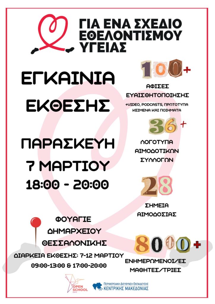 Λίγες μέρες πριν την πραγματοποίηση των μαθητικών αιμοδοσιών σε 68 λύκεια της Κεντρικής Μακεδονίας και τη συμμετοχή περισσότερων από 1700 μαθητών/ριών, έχουμε τη χαρά να εγκαινιάσουμε την έκθεση του προγράμματός.